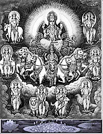 Sri Chakra is the Mother of all Yantras, and is a mystical geometric representation of the Transcendental Supreme, Nondual pure concious-ness with its abstract intelligence. Our Divine Mother has chosen to manifest at our Temple to protect our world from predicted catastrophies and shower Her grace so that we can be aware of “Her” and merge our souls into super soul (“Her”). To achieve this She has granted us many boons along with Mantras, Yantras & Tantric secrets. The transcendence is from Parabrahman to Saguna Brahman, and then to Nadha Brahman, Nadha Bindu (light and sound), to Trimoorthys (Brahma, Vishnu, Shiva), and as various Gods and Goddesses (Istha Devathas). Nada is the Om, the primordial sound which is so immense that creates intense trillion degrees of heat and rapidly cools down forming many universes (multiverse) and is referred to as the Nada Bindu (Big Bang).